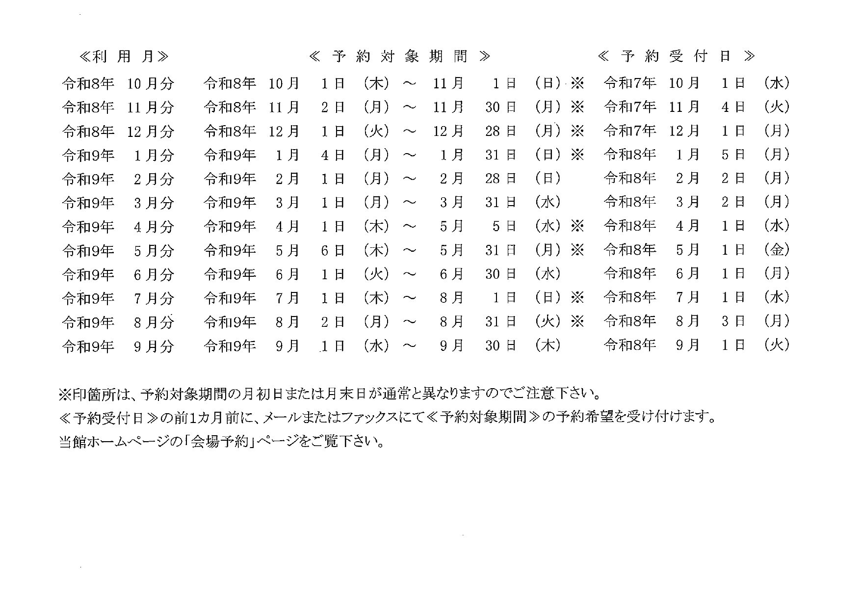 本館・北館 月初受付日のご案内.     令和8年10月分~令和9年9月分